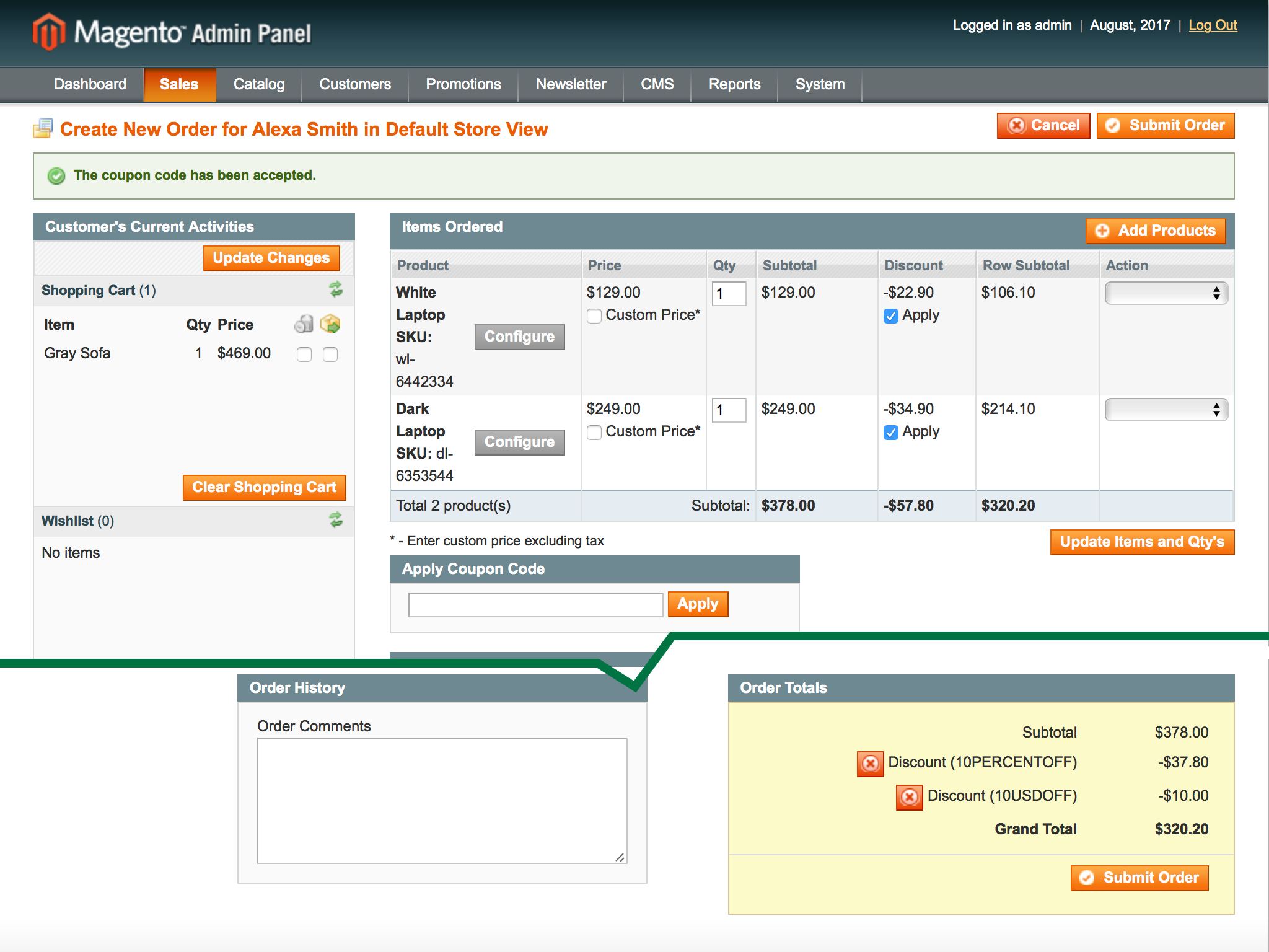 The extension enables customers to apply multiple discount coupons, both cart and checkout (the latter supports Onepage Checkout and Multi-Shipping/Multi-Address Checkout). This function works well for backend orders placed by admin user.